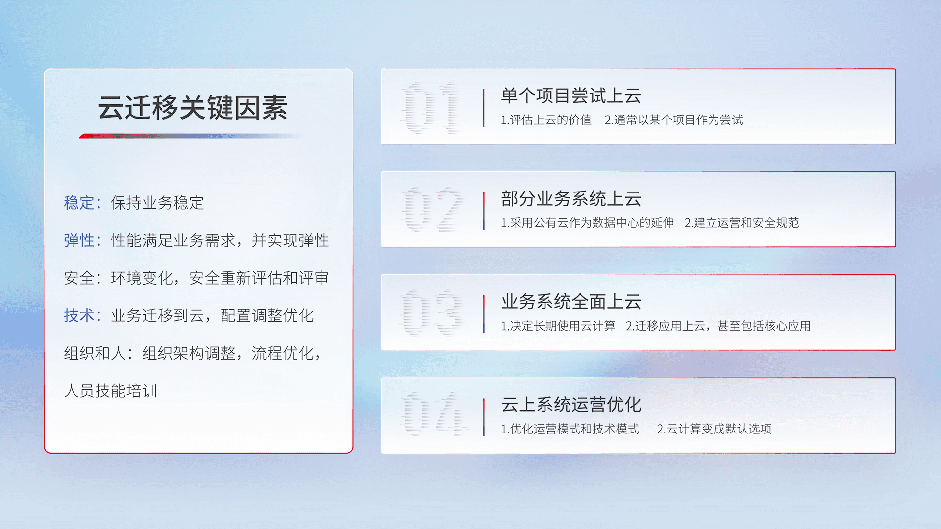 结合实际业务,,,,从规划设计、、云平台选型、、、云原生改造、、、、数据迁移、、、集成交付,,,迁移全过程为客户识别最佳上云路径,,做好风险识别管理,,,设计网络架构、、、身份权限、、、安全审计合规、、、操作审计、、、、日志审计、、监控告警策略、、多站点容灾设计等,,对云上基础设施进行整体规划,,,提升IT治理水平,,以满足弹性、、、高可用、、、高性能的需求。。